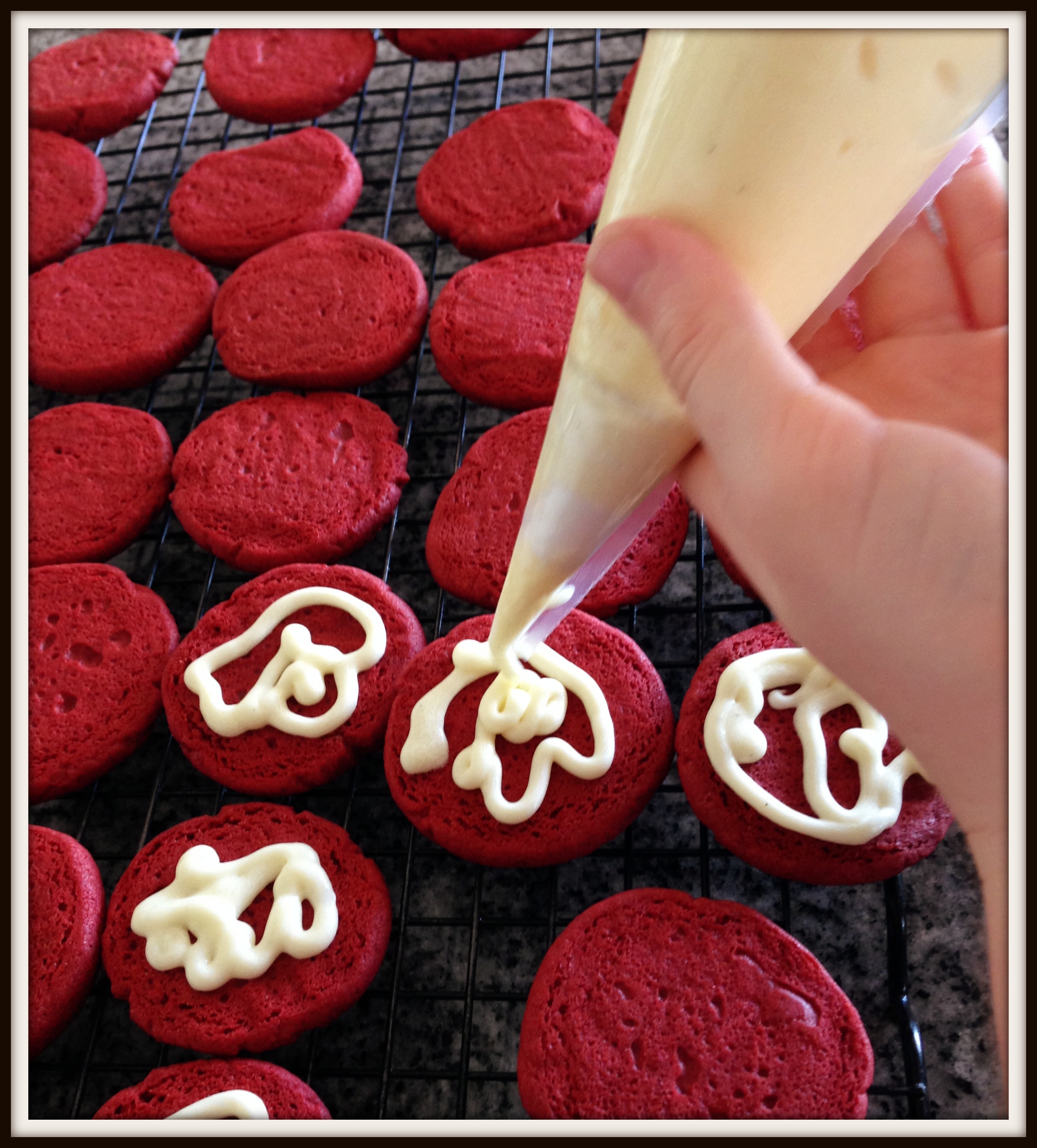 This recipe from Cooking Classy was titled red velvet Oreos, but I switched her filling recipe for a cream cheese one as I think cream cheese *anything* is the icing on the cake, as it were. Here is the original recipe www.cookingclassy.com/2014/11/red-velvet-oreos/